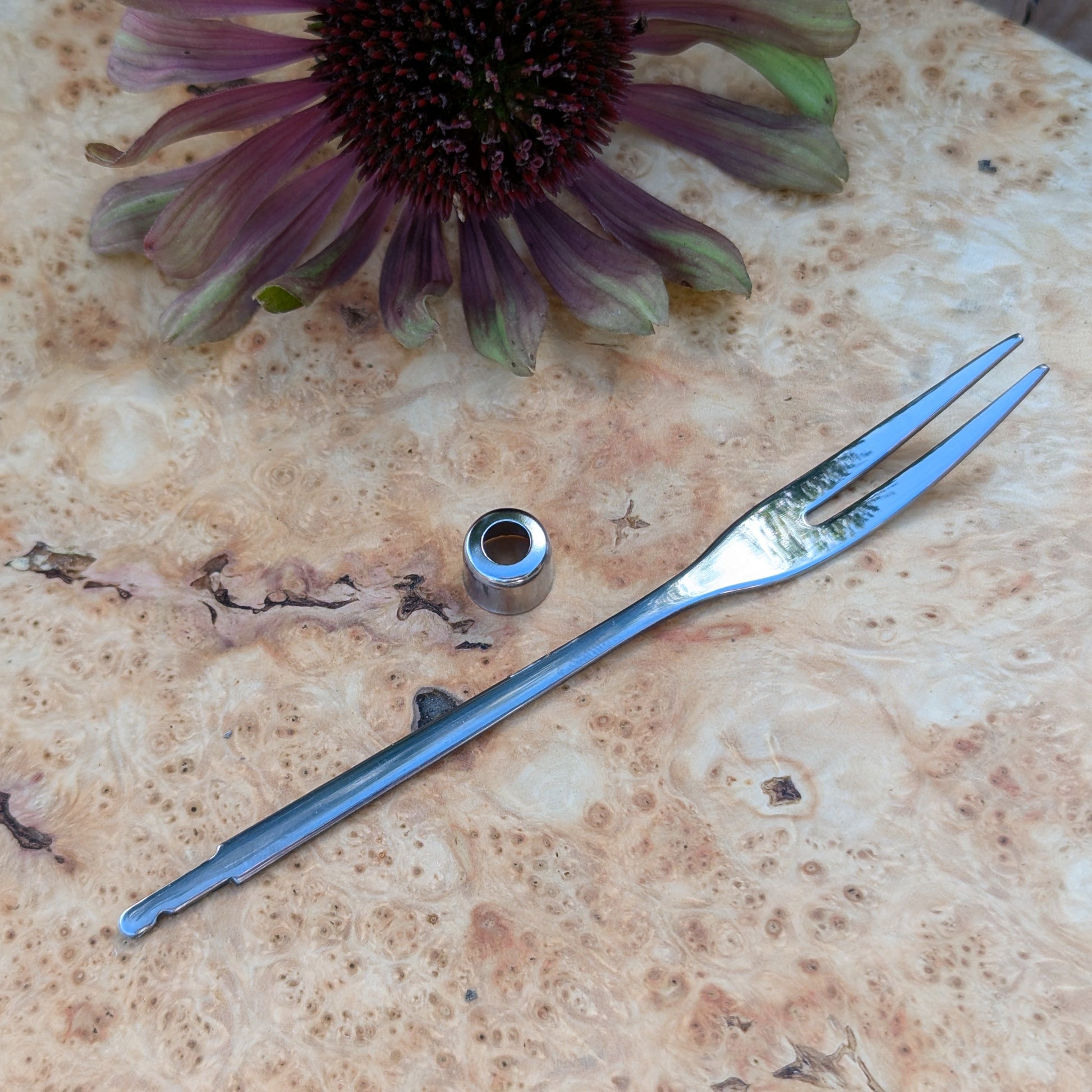 A very handy olive/pickle fork - Cutlery Blank. Length from tip of fork to shaft is approx. 103mm, approx. length of shaft 12mm - Total approx. length 115mm / 11.5cm / 4.6 inches. Comes with a ferrule as shown. Perfect for any crafts-person wanting to make unique items